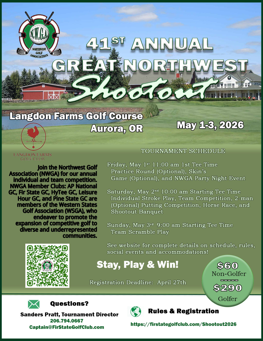 Refunds due to cancellation before the close of entry are subject to a $10 service charge and must be requested by April 27, 2026. After the close of entry, no refund will be issued except for cancellation of tournament by NWGA or closure of golf course.